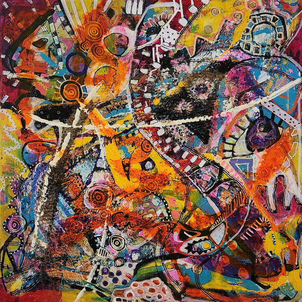 24"x24'x.75" Painting on Canvas, Multimedium including Acrylic Paint, Paint Markers, Alcohol Ink, and Netting for added texture. Design continues onto edges and is wired, ready to hang.